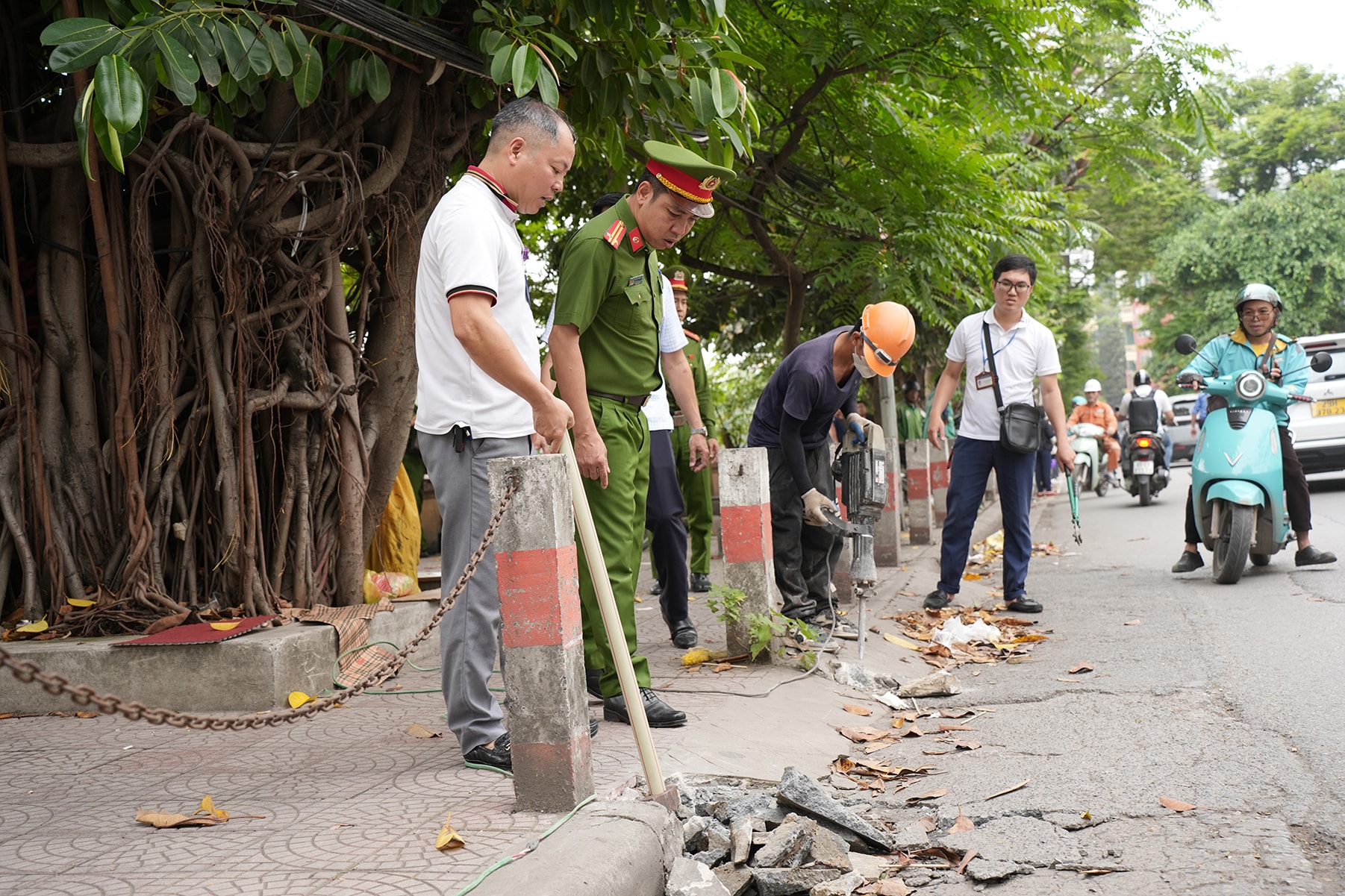 Lực lượng chức năng phường Láng triển khai phá dỡ bục bệ, vật cản... giành lại vỉa hè cho người đi bộ. Ảnh: Phạm Mạnh