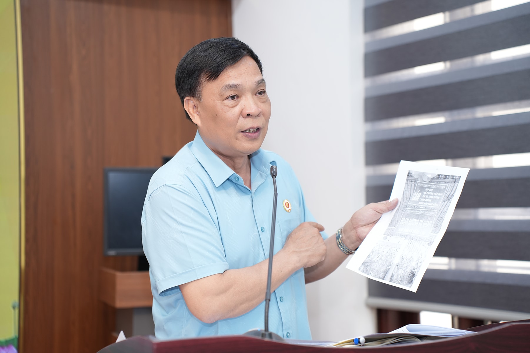 Chủ tịch Hội Cựu Chiến binh phường Láng Nguyễn Đức Thịnh chia sẻ về những mô hình hay trong quá trình giải quyết 5 "điểm nghẽn" trên địa bàn. Ảnh: Phạm Mạnh